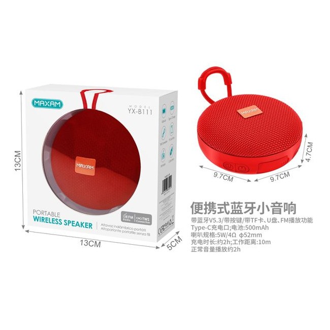 YX-B111 Altavoz portátil rojo con bluetooth 5W*1 500mAh compatible con TWS, radio FM, TF/USB YX-B111